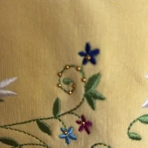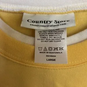 Bright yellow sweatshirt with floral embroidery and embellishments. Features white and green red and blue floral design. Country Store Brand. Perfect condition. Looks like it has never been worn. It is very cottage core, granny core. It is very soft, 50% cotton and 50% poly. The neckline looks layered even though. PTP 22, length 25.