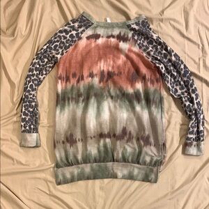 Stylish sweatshirt with a multicolor tie-dye body and leopard print sleeves. Features shades of green, brown, and gray.