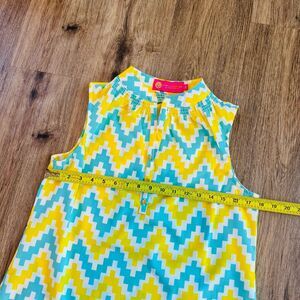This Macbeth Collection sleeveless tank top shirt in size S features a cheerful chevron pattern in yellow and teal blue/green. The V-neckline and button closure add a touch of elegance to this casual piece, which is perfect for summer or spring. The garment is machine washable for easy care, and the regular fit ensures comfort.