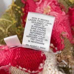 Size medium, by Fisher Hill. Has sewn on pearl colored beads for hummingbird's eyes and tassel-like yellow strings at the flower centers. Such a beautiful and unique statement piece.