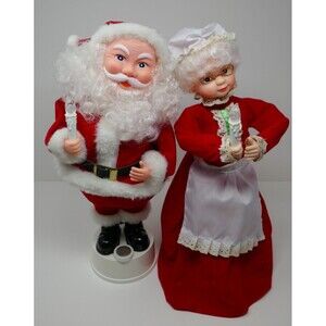 These Santa's Best Mr & Mrs Santa Claus Lighted Animated Motionette Figures are a festive addition to your Christmas decor. Standing at 16.25 inches tall, these large figures feature a traditional Santa Claus theme with some wear from age. Perfect for indoor use, this pair of motionettes from the late 20th century are a nostalgic and charming collectible for holiday enthusiasts. Made from mixed materials and requiring batteries for operation, these figures bring a touch of animation and whimsy to your seasonal display.