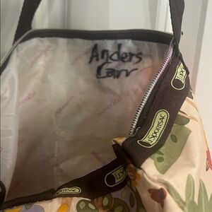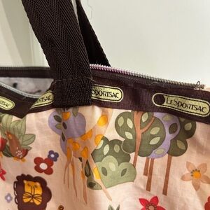 Vintage LeSportsac Colorful Animal Print Tote Bag. Top zipper needs replacing. Zips from the bottom working zipper into a small travel pouch size perfect for storing in the car in a larger bag in a suitcase or backpack. Love the adorable jungle theme. Does have a name written inside with sharpie, but that is not noticeable unless the tote is open. The broken zipper should be easy to replace