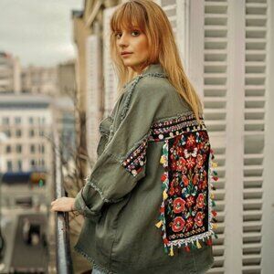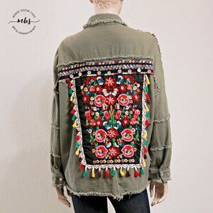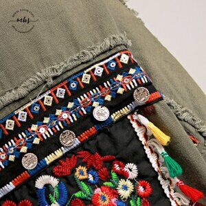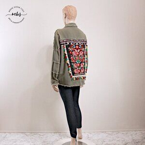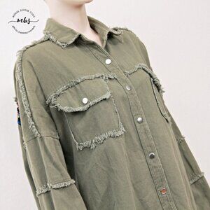 Jubylee Bohemian Floral Embroidered Festival Frayed Hem Snap Closure Oversized Shirt Jacket Green Women One Size