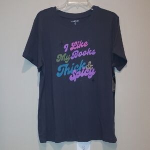 Size 0 (Large). Black, charcoal grey, purple, pink, blue. I like my books Thick & Spicy. Pit to pit 23". Length 28". Arm length from pit 2" with cuffed sleeves. Nwt. Great girl ide for that avid reader.