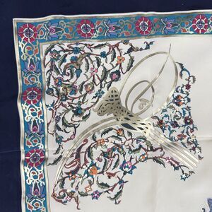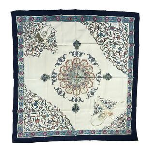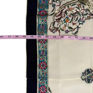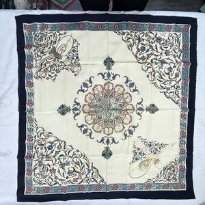 Beautiful floral vine scarf with metallic gold accent. Scarf in very good condition. I apologize for my photos and the color is much better than what is shown. Brand: Piramit Content: Silk Measures 33.5 x 33.5"