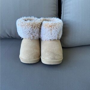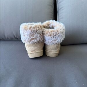 These warm tan boots are perfect for keeping your child's feet cozy. The plush lining adds extra comfort and style.