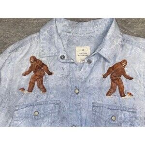 Features: Vintage floral/paisely fabric with embroidered yetti/sasquatch on the front. Two front pockets. Pearl snap closure.