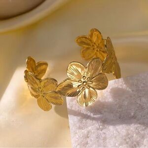 Chic gold floral earrings with intricate petal design. Perfect for adding elegance to any look.