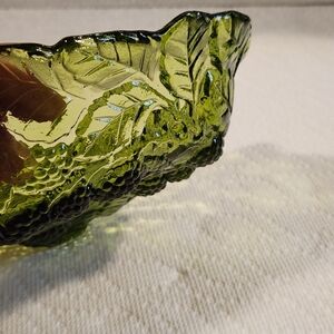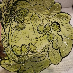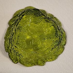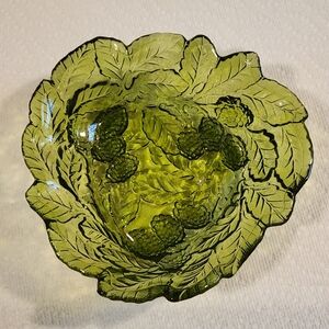 Vintage Indiana Glass Loganberry green glass candy dish or trinket dish with berries and leaves design. Beautiful discontinued piece in very good pre-owned condition.