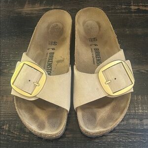 Birkenstock sandals in color sandcastle nubuck. Features a stylish gold buckle. Size EU 40 US 9-9.5. Worn but good condition. Smoke free home.
