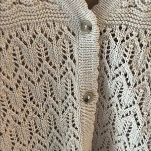 Elegant cream cardigan with intricate knit design. Ideal for layering and adding a touch of sophistication.