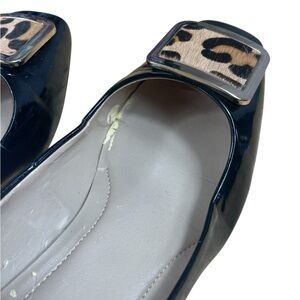 Stylish black flats featuring a bold animal print accent. Designed by Ellen Tracy for a chic look.