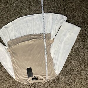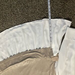 New with tags COCOMO Woman blouse, size 1X. Two-tone layered look: soft taupe knit overlay with a white contrast underlayer. Crew neckline, pull-on style (no buttons), short flounce/peplum hem and relaxed bell sleeves; decorative side tabs at the waist. Comfortable stretch fit. Fabric: shell 92% polyester, 8% spandex; contrast 100% polyester. Care: hand wash cold, line dry, warm iron if needed. Easy to dress up for work or pair with jeans for a chic casual outfit.
