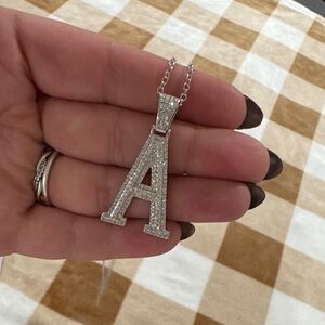 This is a moissanite necklace with a letter "A" pendant and a GRA (Gemological Research Association) certificate.