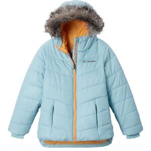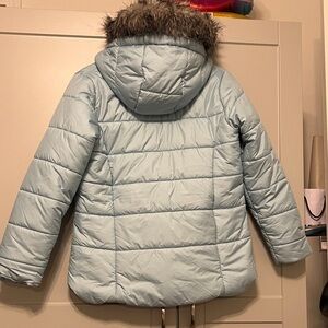 Sky blue puffer jacket by Columbia. Features faux fur hood and warm design. Like new condition