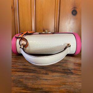 There is some light scuffing or color transfer on the back of the bag that I was unable to remove, but it could be hidden with white paint of some kind. The strap is not original to the bag and was purchased at a later date in an attempt to match the colors in the bag. The strap is removable. There is some light/minor scuffing on the hardware. All flaws are circled in the photos.