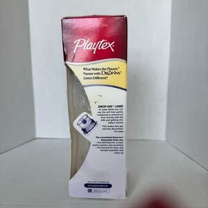 New in box Playtex Nurser Bottle with Drop-Ins Liners. Contains one 8-10oz bottle with Naturalatch silicone nipple and 5 pre-sterilized drip-ins liners. Size 3 months+ and medium flow. Uniquely designed to reduce colic. Convenient disposable liner collapses to keep air out of the milk. The angled position promotes semi-upright feeding.