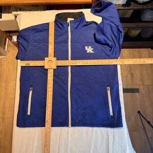 The product is a vintage Kentucky Wildcats Champion brand jacket in size XL, featuring a full zip closure and the iconic team logo accents. Made of polyester, this men's hoodie-style jacket in blue color is perfect for fans of the Kentucky Wildcats looking to show their team spirit in style. With its retro design and high-quality construction from a reputable brand like Champion, this jacket is a must-have addition to any fan's wardrobe.