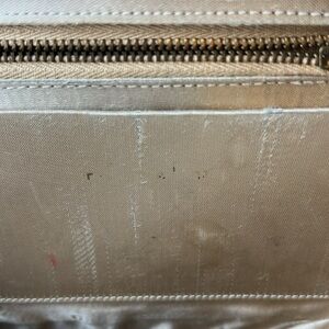 Features: bronze faux leather handle, clasp closure, 1 zipper pocket, 1 slip pocket
