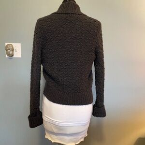Excellent condition cashmere sweater in a dark gray color. No holes, but some pilling on the under side of the sleeves. Sweater is beautiful, with a soft feel. Size marked is large, but please check the measurements and compare with your own garments for best fit. Open front style.