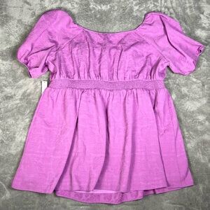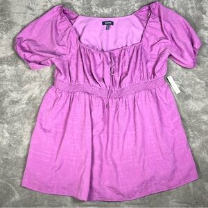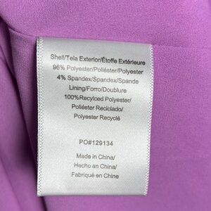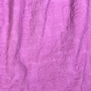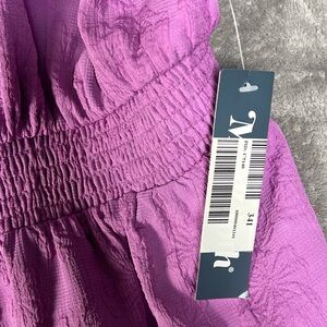 Description- purple in color. Floral, embossed like print. Smocking. Front tie accent. Mini-knee length. Satin like texture.