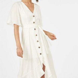 Elegant white high low dress. Features button front and tie waist. Flowy short sleeves.