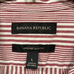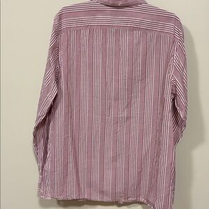 Stylish red and white striped shirt. Casual button-down design. Ideal for versatile wear.
