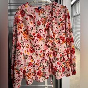 Plus size dark blue short sleeve shirt. Scoop neck with tie closure. White embroidered detail going down the front. Run small. Caribbean Joe woman brand. Size 3X. 100% cotton.