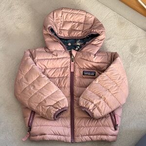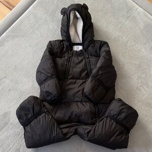 Cozy puffer jacket with hood. Play condition for a few patched spots. Lots of life left! Size 6-12m but fit my kids much longer than that.