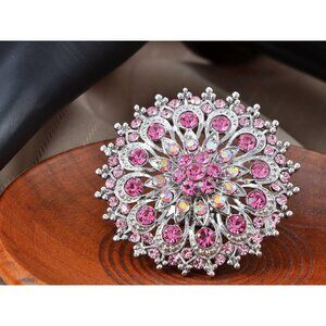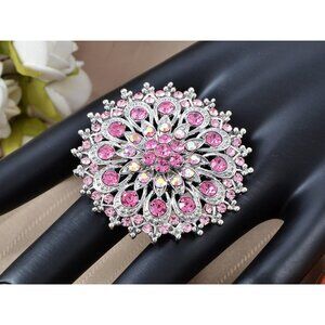Gorgeous large flower design. If you're looking for something that'll get you noticed from across the bar than look no further. This stunning cluster ring has a large flower with petals made of light rose pink colored crystal rhinestones. The crystals are different sizes for a unique cluster that stands out by catching the light just right.