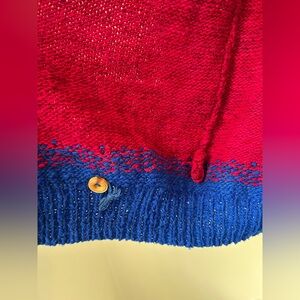 Beautiful 100% lambswool fair isle cardigan in cranberry/blue/teal with wooden buttons.