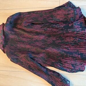 This stunning blazer features a deep burgundy/ plum color with intricate patterns and a unique flared silhouette. It has a zipper front for easy wear and a stylish collar