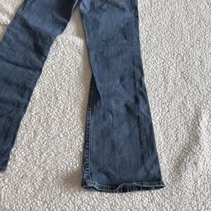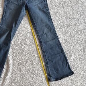 The product is a pair of vintage Calvin Klein faded flare jeans in size 8 with a regular fit and a mid-rise waist. These blue denim jeans feature a solid pattern, button closure, and zipper accents. They are made from a cotton blend fabric with a medium wash and are accented with the Calvin Klein logo. The jeans have a flared style, 5-pocket design, and a 32-inch inseam, making them a stylish and versatile addition to any woman's wardrobe.