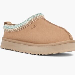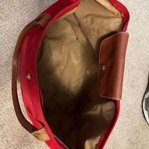 Elegant red tote with brown leather handles. Corners of bag have small holes