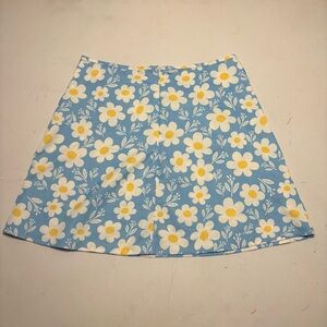 Step out in style with this delightful A-line skirt. Featuring a vibrant blue background adorned with cheerful yellow and white floral patterns, it's perfect for any occasion.