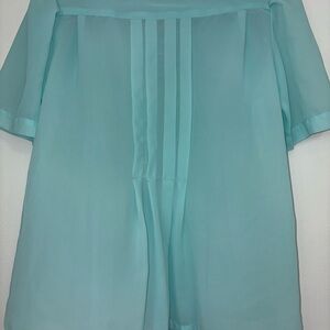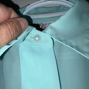 This chic light blue blouse offers a stylish and comfortable fit, perfect for any occasion. Its soft fabric and classic design make it a versatile addition to your wardrobe. Blouse is sheer with shoulder pads. P2P 18” hem to bottom hem 22.5
