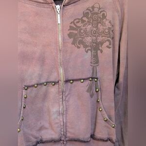 - zips up and has a hood, studded and distressed details