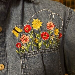 Stylish denim shirt with colorful floral embroidery. Features short sleeves and button-up front.