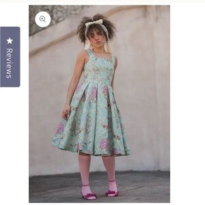 Elegant blue dress with floral pattern. Sleeveless design. Perfect for special occasions.