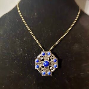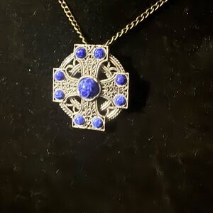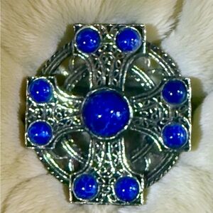 This is a beautiful Celtic cross which can be worn as a pendant or a brooch. It features a striking silver ornate design adorned with vibrant blue stones. Perfect for adding a touch of unique fashion to your outfit. It is in good condition but may show some signs of use as would be expected for vintage jewelry.
