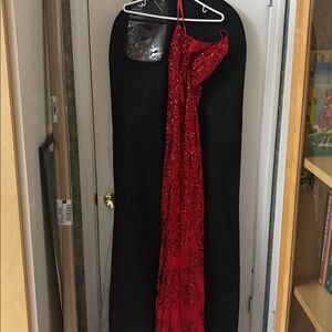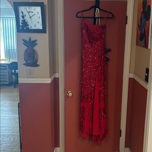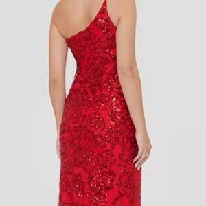 Dazzle in this red one-shoulder gown by Blondie Nites. Features intricate detailing and a bold slit.