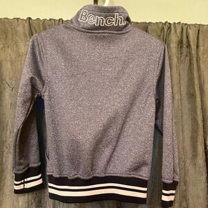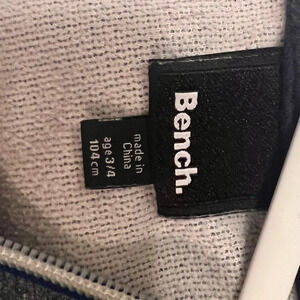 Size 3-4 Bench zip up sweater. The white shows signs of age with pilling that can be picked off and some discoloration. Zipper has some white missing. It is a beautiful sweater that still has a lot of life left in it