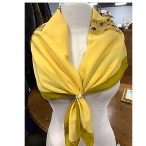 SIGNED must de Cartier hand rolled and hand sewn silk scarf, titled Panthere, made in Italy with original tag showing fabric and origin. Features Cartier Jeweled Panthere Bracelet with wild cat heads facing each other and interlocking Cartier CC in opposite corner. Size 31.25”x32”. Deep yellow with saffron border. Stunning design with bold color. Collectible. Never used. Pristine condition.