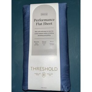 The Threshold KING 400 Thread Count Performance Flat Sheet in Metallic Blue is a luxurious addition to any bedroom. Made from 100% cotton with a smooth sateen weave, this rectangular flat sheet features a solid blue color and is machine washable for easy care. With dimensions of 110 inches in length and 104 inches in width, this high-quality flat sheet from the Threshold brand offers both style and comfort for a king-sized bed. Perfect for creating a cozy and stylish bedroom environment.