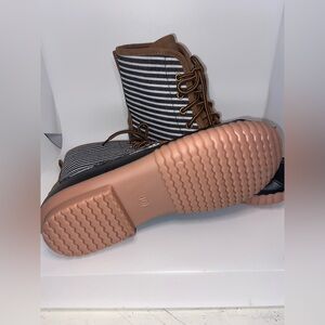 MARLEYLILLY~Navy/white/tan ticking fabric duck boots~Women’s size 10~EUC