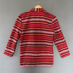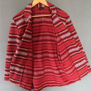 Gorgeous vintage 1990s Léger Southwestern-style blazer featuring a vibrant red base with multicolor woven stripes and geometric patterns. This cozy, blanket-style jacket has a soft textured weave, a silver concho button with black leather tie, and two front patch pockets. Perfect for adding a Western or boho touch to your outfit.