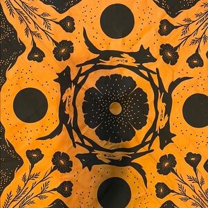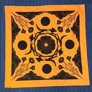 Eradura Southwest-inspired bandana with an intricate brown/burnt orange and black printed design featuring foxes, rabbits, and flowers. Cotton.