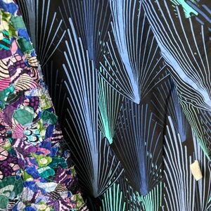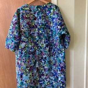 It's almost impossible to describe the feast for the eyes that is this exquisite Zuri thigh-length jacket. Hundreds of appliqued and quilted fabric scraps in the colorway of cerulean, eggplant, forest and new green, pops of pink and teal to give the overall impression of irises in the shade. The lining in black, purple, blue, and jade is a delightful surprise. This is a capaciously sized medium jacket with a chest measurement of 27" and a back neck to hem measurement of 27". The coat has heft to it, like a comforting weighted blanket to wear, and it has pockets. This item has never been worn and is in perfect condition.