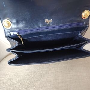 Beautiful Excellent condition 1970S Flap Gucci bag. Beautiful collectors bag, comes with 2 COAs. Offers 2 large compartments with one zipper pocket on inside. Leather exterior with canvas and blue suede leather on inside with gold hardware. Measures 11 wide 9 long, Strap is 16 inches in longest hole. Slight rub on corner, beautiful strong well made vintage bag that will last for many more years to come. 🔥🔥🔥