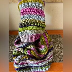 Vibrant crochet slouch hat and scarf set with stripes of green, purple, and gray. Perfect for adding color to your winter wardrobe.